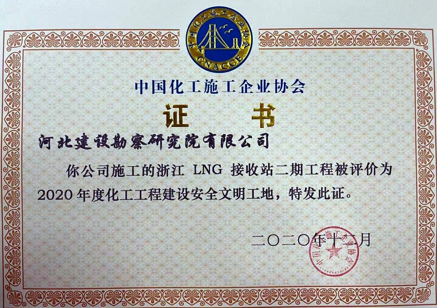 公司浙江LNG項目被中國化工施工企業(yè)協(xié)會評為2020年度化工工程建設(shè)安全文明工地