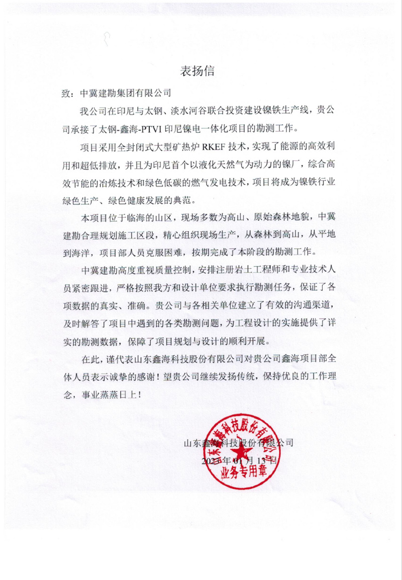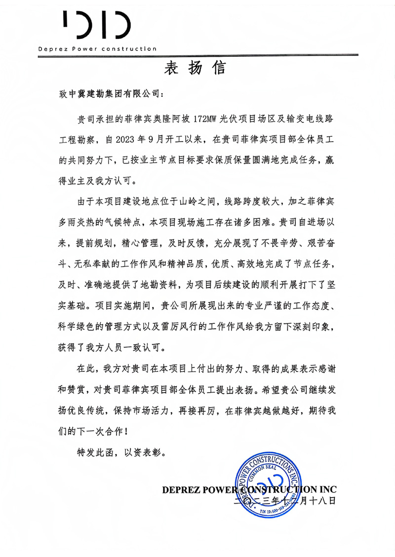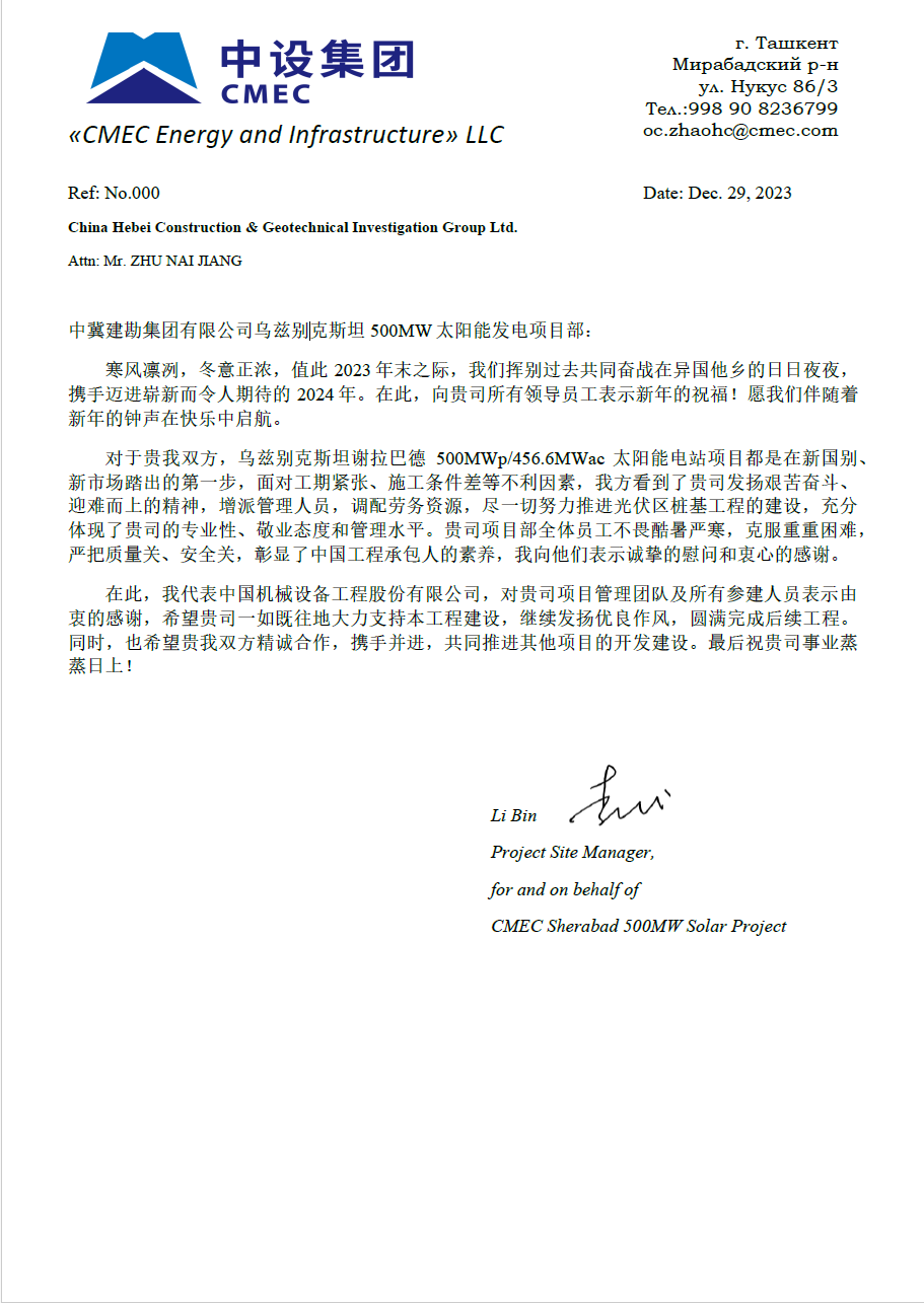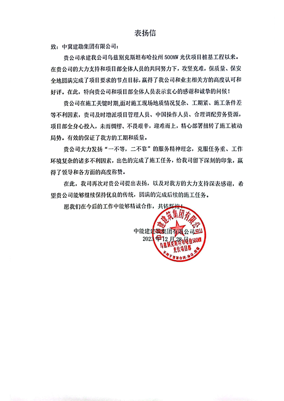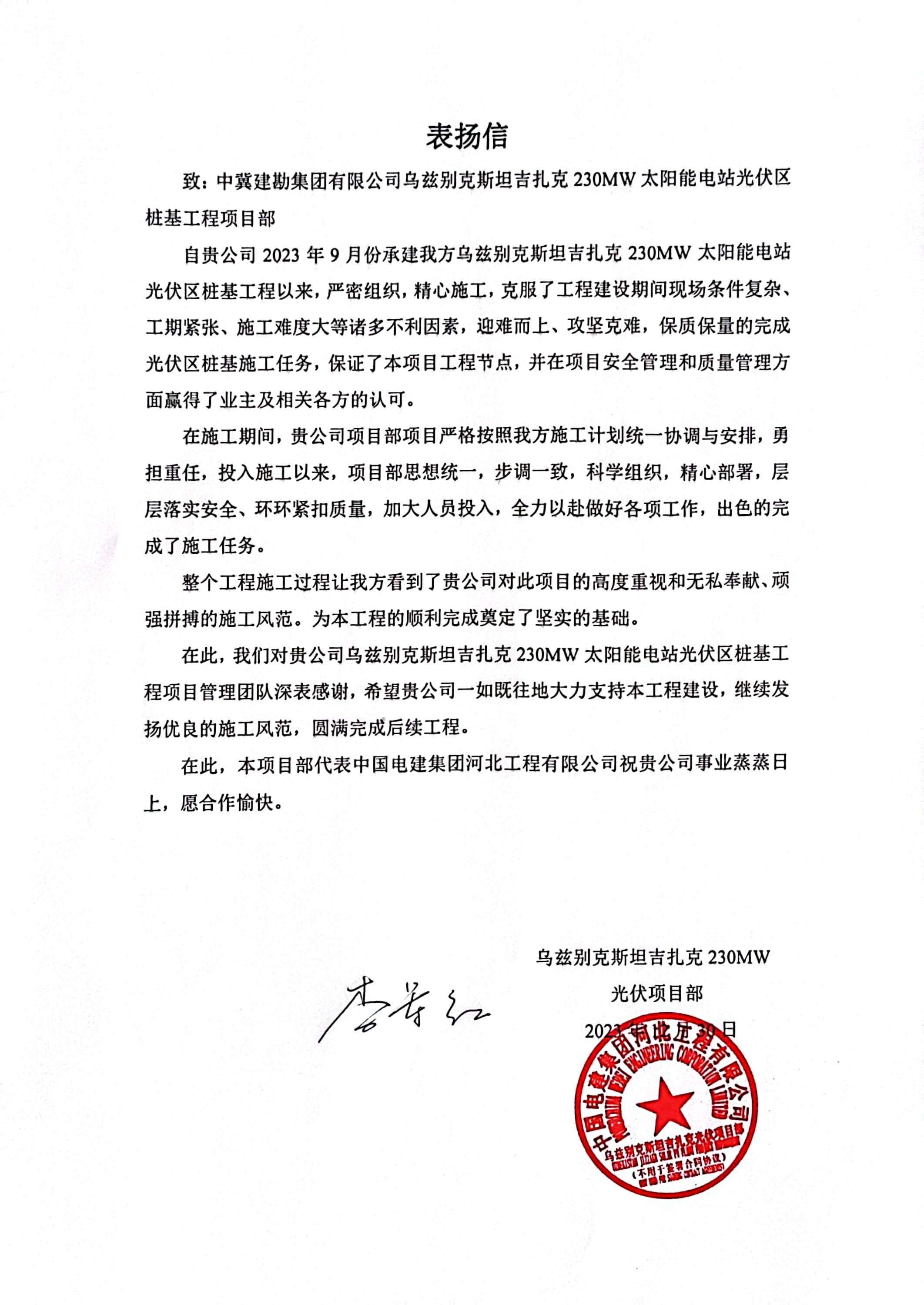 中國電建集團(tuán)河北工程有限公司發(fā)來的表揚信,對在烏茲別克斯坦吉扎克230MW太陽能電站光伏項目施工期間,項目部思想統(tǒng)一,科學(xué)組織,精心部署,層層落實安全、環(huán)環(huán)緊扣質(zhì)量,全力以赴做好各項工作的奮斗精神,給予了高度評價和感謝。