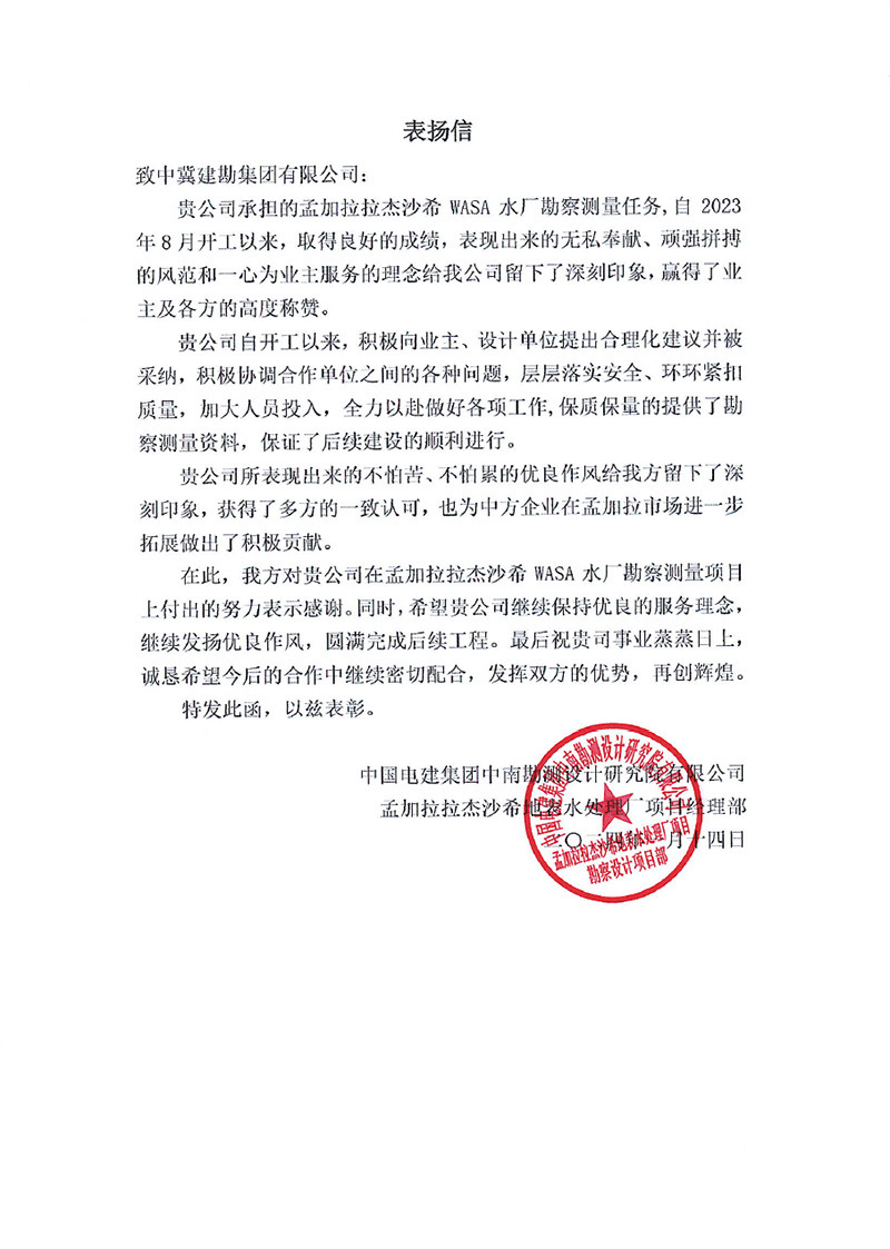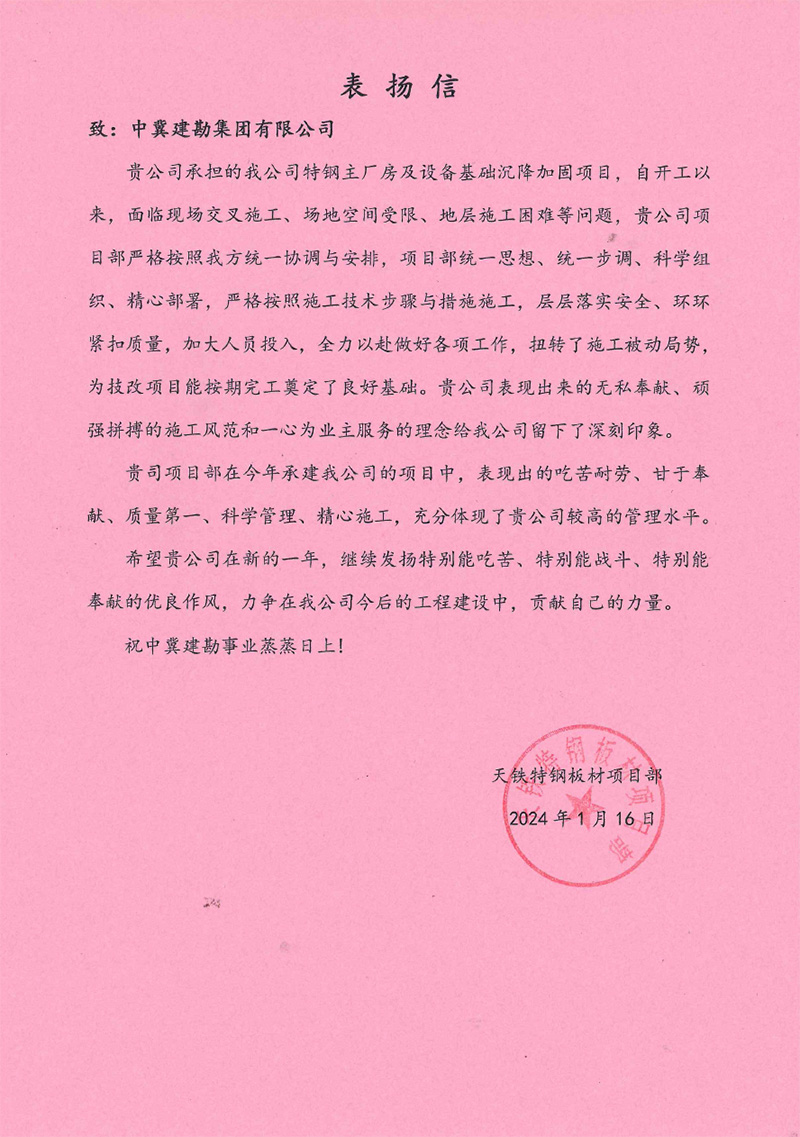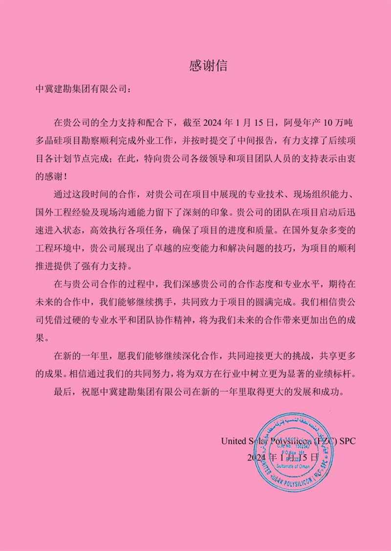 近日,集團(tuán)公司陸續(xù)收到國內(nèi)外項目業(yè)主發(fā)來的表揚信,信中對我公司的項目管理、團(tuán)隊建設(shè)、安全文明施工、技術(shù)質(zhì)量管控等,給予了高度評價,同時送上了新年一年的祝福。