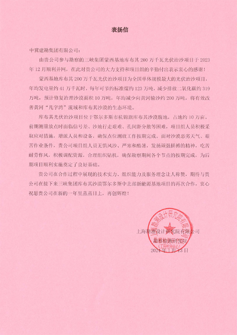 中能建建筑集團(tuán)有限公司發(fā)來的表揚信,對在烏茲別克斯坦布哈拉州500MW光伏項目建設(shè)過程中,項目部全體人員發(fā)揚“一不等,二不靠”的服務(wù)理念,克服工作環(huán)境和地質(zhì)復(fù)雜等困難,在公司的大力支持和項目全體人員的共同努力下,圓滿完成了項目要求的節(jié)點目標(biāo),特向我公司表示衷心的感謝和誠摯的問候,愿今后繼續(xù)精誠合作,共鑄輝煌。