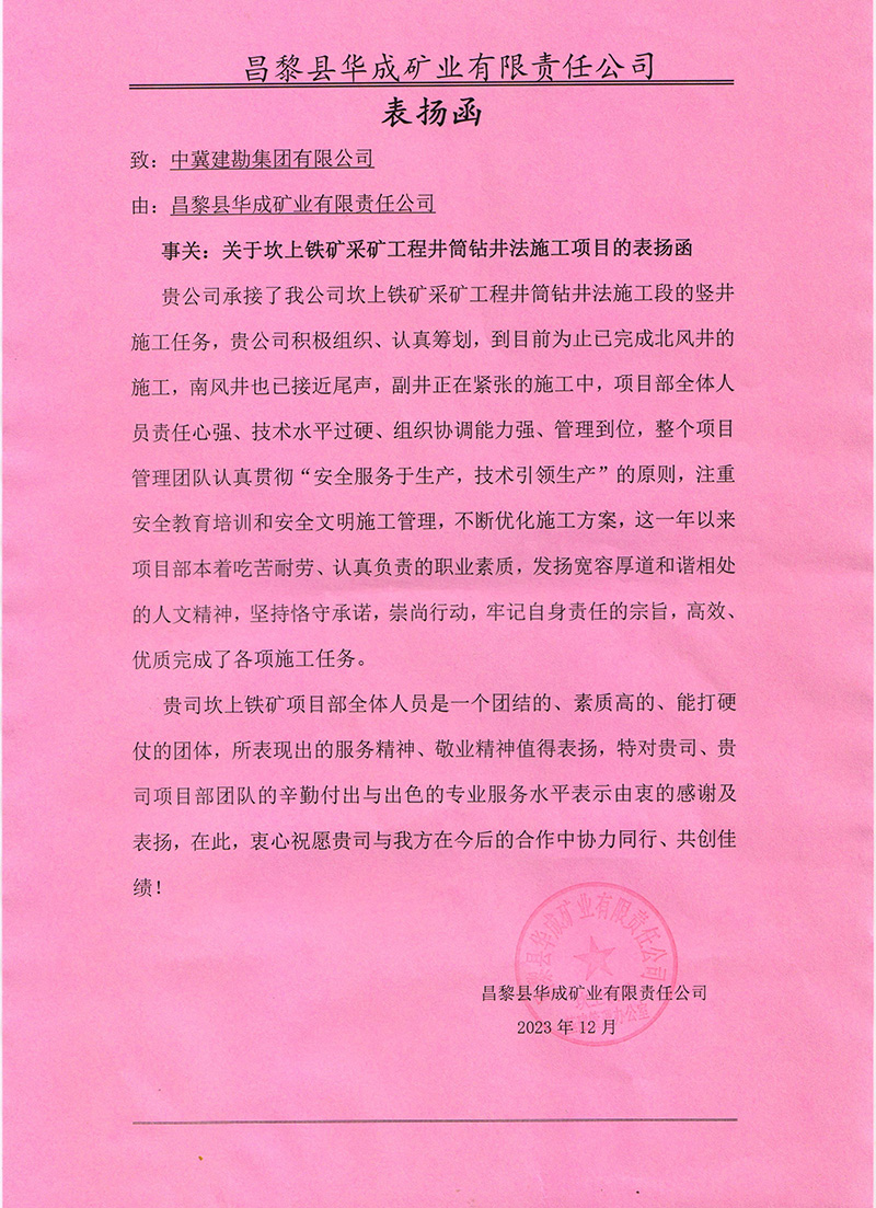 昌黎縣華成礦業(yè)有限責(zé)任公司發(fā)來的表揚函,對我公司在坎上鐵礦采礦工程井筒鉆進(jìn)法施工項目施工過程中,積極組織,認(rèn)真籌劃,以及項目部全體人員責(zé)任心強、技術(shù)水平過硬、組織協(xié)調(diào)能力強、管理到位,認(rèn)真貫徹“安全服務(wù)于生產(chǎn),技術(shù)引領(lǐng)生產(chǎn)”的原則,不斷優(yōu)化施工方案,已順利完成北風(fēng)井的施工,南風(fēng)井也即將完成,表示由衷的感謝和表揚,希望今后合作中協(xié)力同行、共創(chuàng)佳績。
