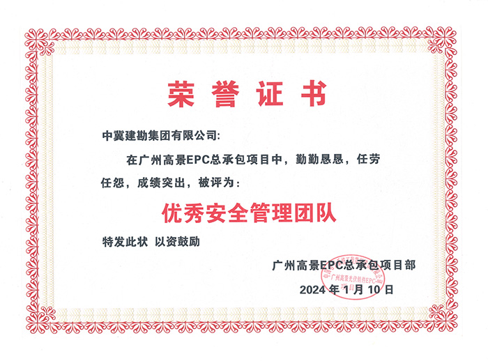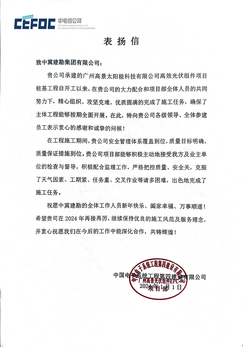 中國電子系統(tǒng)工程第四建設(shè)有限公司發(fā)來的表揚信,對我公司在廣州高景太陽能科技有限公司高效光伏組件項目建設(shè)過程中,公司的大力配合和項目部全體人員的共同努力下,安全管理體系覆蓋到位,質(zhì)量保證措施到位,嚴(yán)格把控質(zhì)量、安全關(guān),出色完成了施工任務(wù),特向我公司各級領(lǐng)導(dǎo)、全體參建員工表示衷心的感謝,并授予“優(yōu)秀安全管理團(tuán)隊”和“優(yōu)秀資料包商”榮譽。